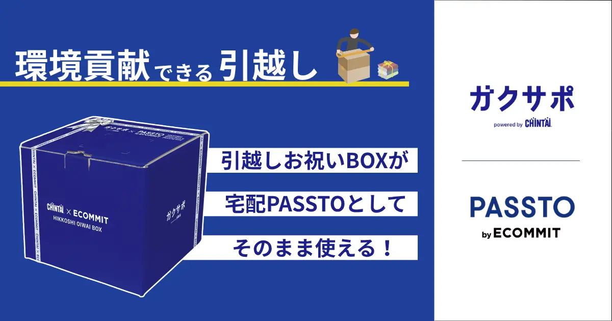 ECOMMITはCHINTAIと連携し、学生向け新生活支援サービス「ガクサポ」で提供する引越しお祝いBOXを、不要品回収サービス「宅配PASSTO」の専用段ボールとして活用する取り組みを始めた。引っ越し時に発生しやすい衣類や生活雑貨などを、自宅から無料で手放せる仕組みを整え、学生の新生活を支えながら循環型の暮らしを促す。対象はCHINTAI掲載の不動産会社で賃貸契約を結んだ学生で、先着600人に提供する。