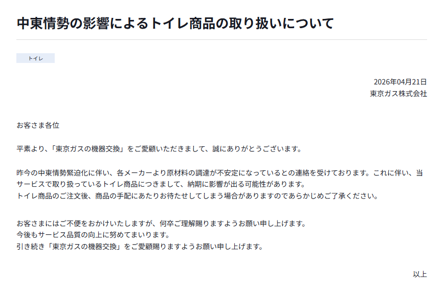 【各種住宅・建築・他】東京ガス:中東情勢でトイレ商品に納期影響、機器交換サービスで遅延の可能性