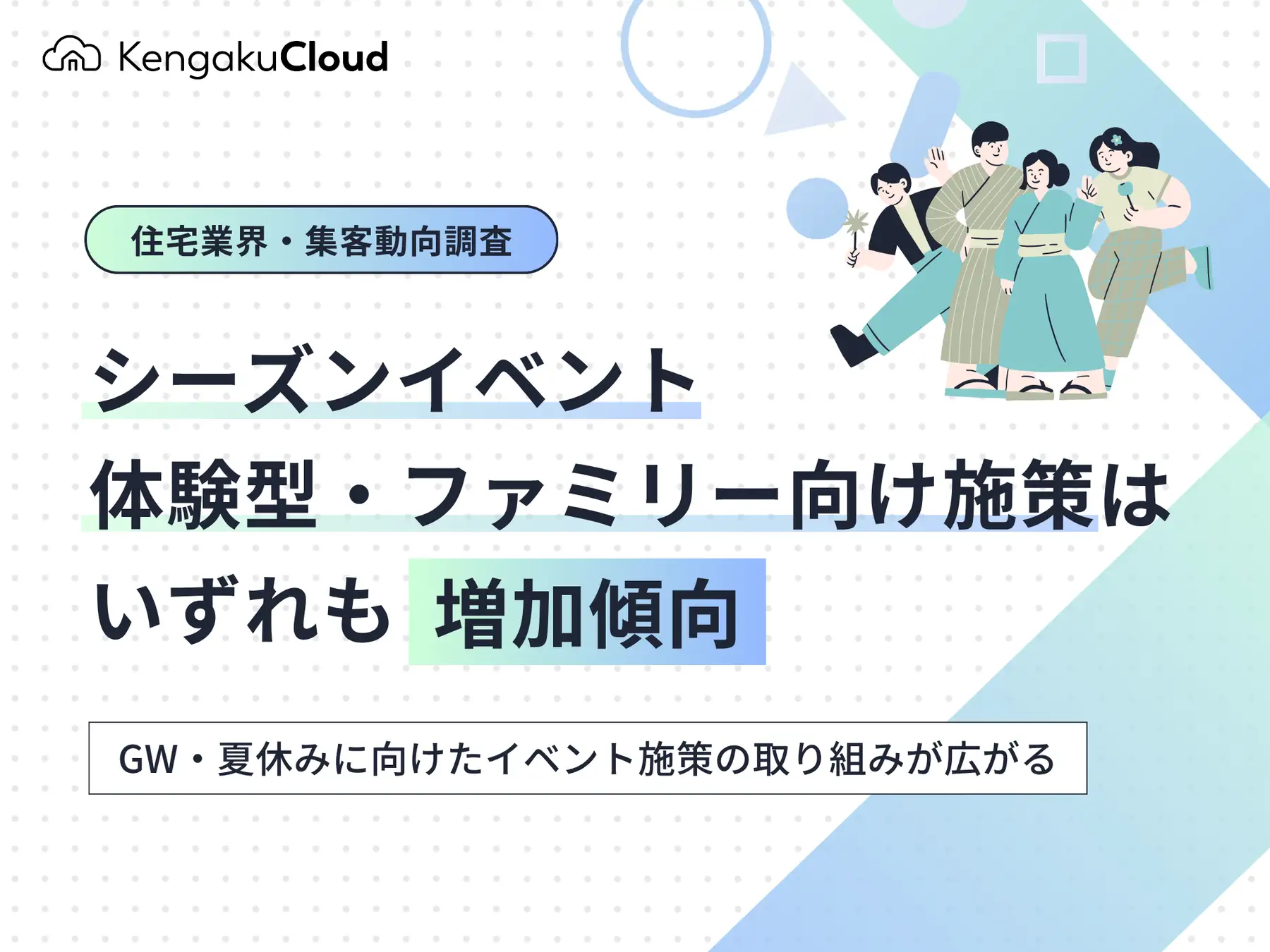 具体策では夏休み・お盆期間のイベントが57.9%で最多となり、木工教室やお菓子作り、ピザ作り、縁日など親子参加型の体験企画が目立った。キッズスペースの設置や保育士による見守り対応、子ども向けプレゼントの用意など、来場時の安心感を高める取り組みも進む。地域イベントや学校、祭りとの連携も広がり、地域接点づくりと集客導線の設計が重視されている。来場集客ツール「KengakuCloud」を展開する同社は、多様な施策への対応を通じ住宅事業者の集客DXを支援する。