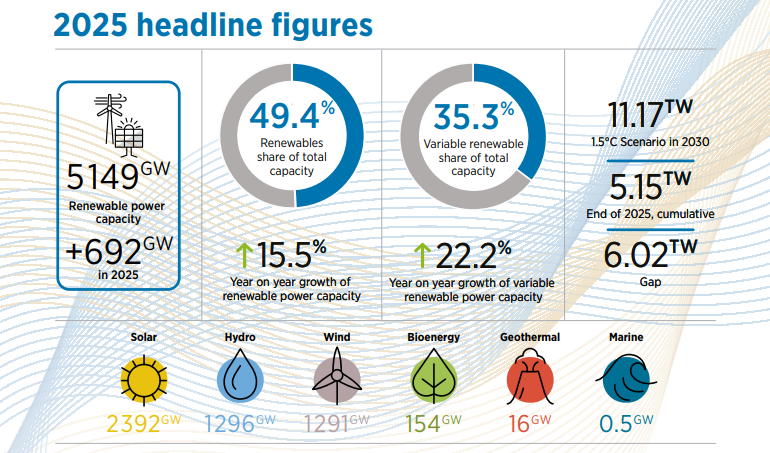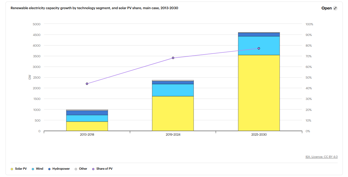 世界の太陽光発電市場は、かつてない規模で拡大している。国際再生可能エネルギー機関(IRENA)によると2025年の世界の再生可能エネルギー容量は5,149GWに達し、そのうち太陽光発電は2,392GWと全体の約47%を占める最大電源となった。年間導入量も511GW超と、再エネ拡大の約7割を担う正に主役である。国際エネルギー機関(IEA)も太陽光発電が今後の再エネ市場を牽引するとの見通しを示す。