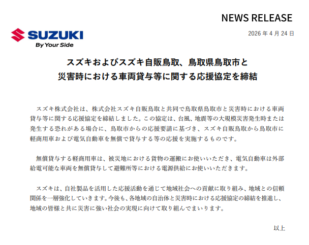 スズキとスズキ自販鳥取は、鳥取県鳥取市と災害時における車両貸与等に関する応援協定を締結した。台風や地震など大規模災害が発生した場合、または発生の恐れがある場合に、鳥取市の要請に基づき車両を無償で貸与する。