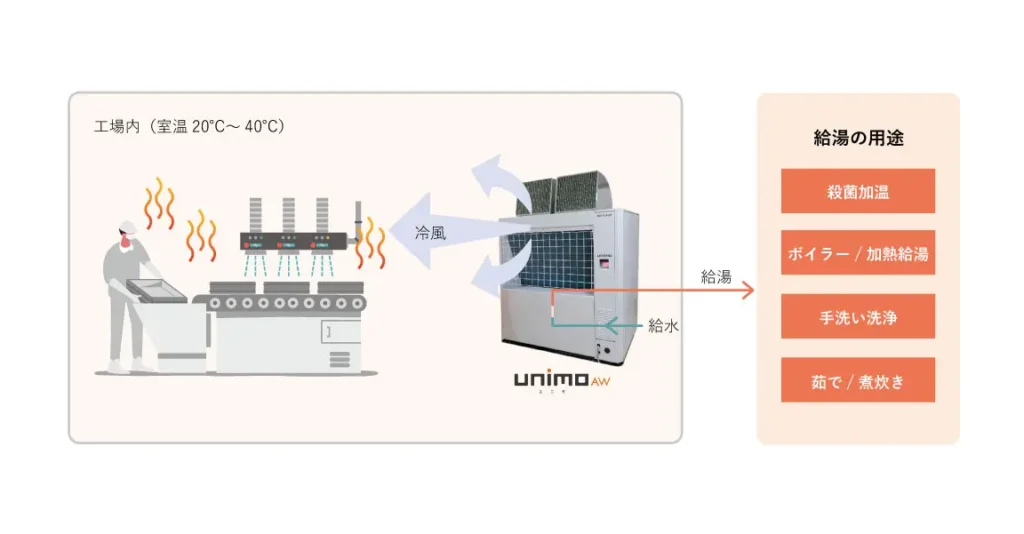 前川製作所は、工場の酷暑対策と省エネ、CO₂排出削減を同時に狙うヒートポンプシステム「ZERO-Cool」の提案を強化する。冷風を工場内に供給しながら、排熱を温水製造に活用する仕組みで、給湯ボイラーの燃料削減分を冷房用電力コストに充てる。