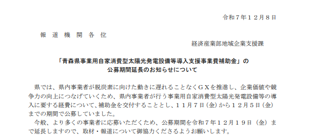 【補助金】青森県:自家消費型太陽光発電補助金の公募期間を延長