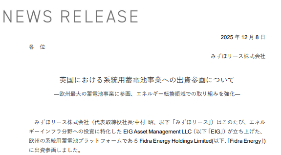 【海外】みずほリース:英国の系統用蓄電池事業に出資参画し欧州最大級プロジェクトへ関与