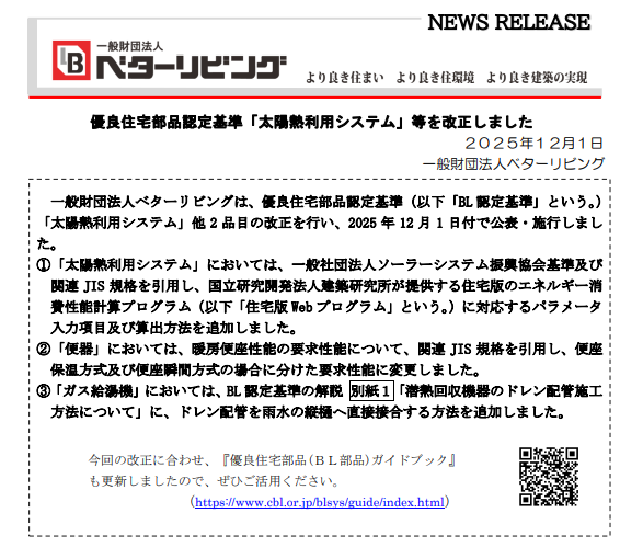 【給湯・空調・換気】ベターリビング:太陽熱利用システムなどBL認定基準を改正