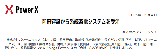 【蓄電関連】PowerX:前田建設から系統蓄電システム「Mega Power」3台を受注