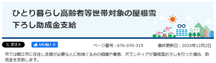 【補助金】鯖江市:ひとり暮らし高齢者等世帯への屋根雪下ろし助成金を支給