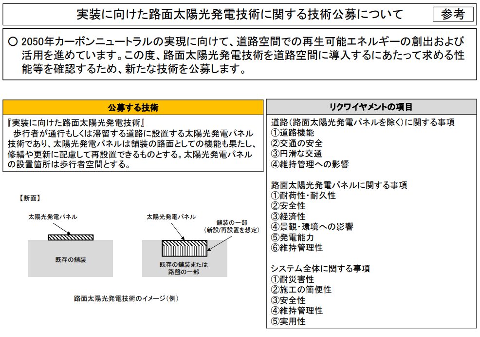 【政策】国土交通省:路面太陽光発電の社会実装に向けた技術公募を開始
