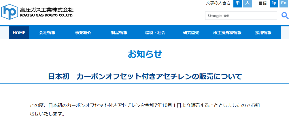 【脱炭素・SDGs・ESG】高圧ガス工業:日本初のカーボンオフセット付きアセチレン販売開始