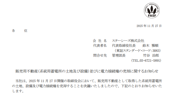 【蓄電関連】スターシーズ:愛知県の系統用蓄電所(土地・設備・接続権)を売却、譲渡益は前期利益の3割規模に