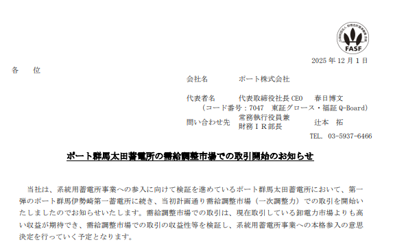 【蓄電関連】ポート:群馬太田蓄電所が需給調整市場で取引開始、3拠点体制で系統用蓄電所事業の本格参入を検証