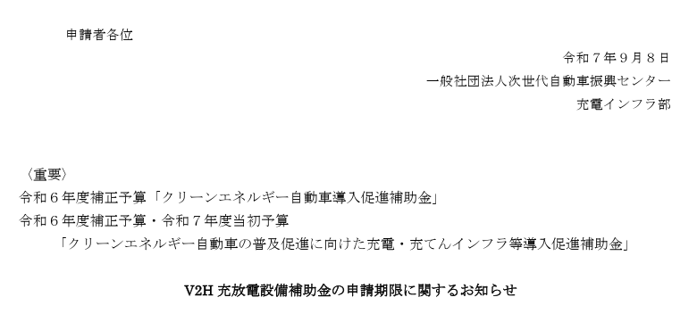 【次世代自動車・充電器】次世代自動車振興センター:V2H補助金申請期限を9月30日と告知