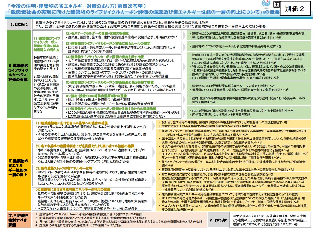 【政策】国交省:住宅・建築物の省エネ対策「第四次答申」を公表―LCCO2評価の制度化を本格検討、2028年度めどに導入へ