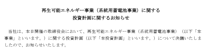 【蓄電関連】クラダシ:系統用蓄電池事業で4案件への投資計画を決議