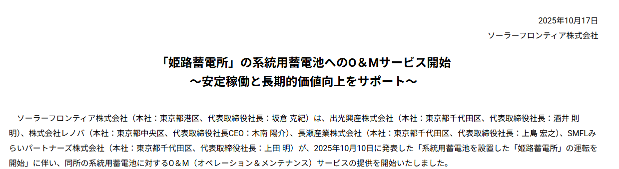 【蓄電関連】ソーラーフロンティア:「姫路蓄電所」系統用蓄電池へのO&Mサービスを開始