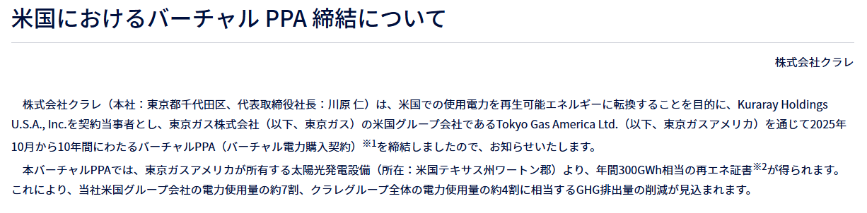 【海外】クラレ:米国でバーチャルPPA締結 再エネ導入でGHG排出削減へ