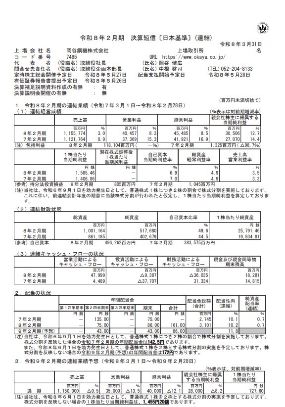 【決算】岡谷鋼機:連結売上高1兆1557億円で増収増益、自動運転とロボット分野の展開も推進