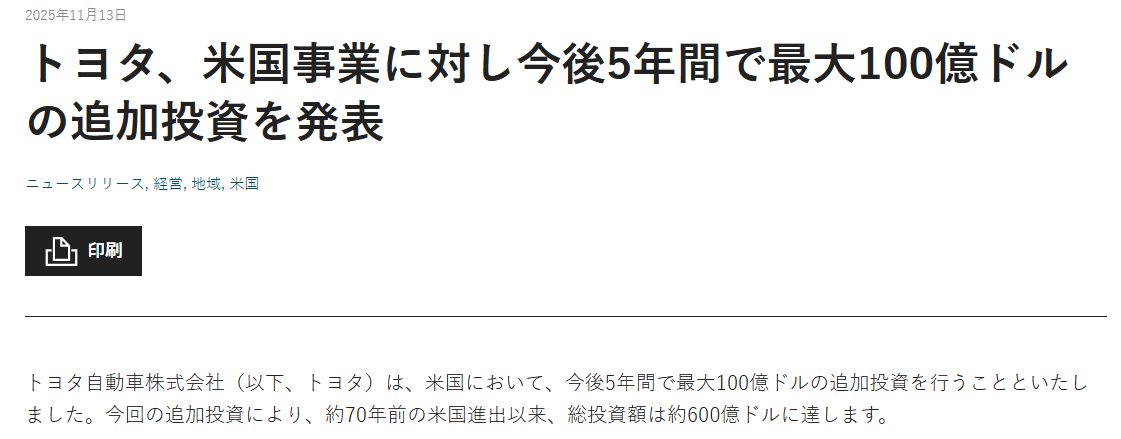 【海外】トヨタ:米国で今後5年最大100億ドル追加投資を発表