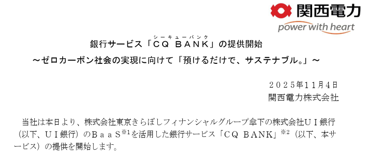 【脱炭素・SDGs・ESG】関西電力:サステナブル預金を掲げた銀行サービス「CQ BANK」開始