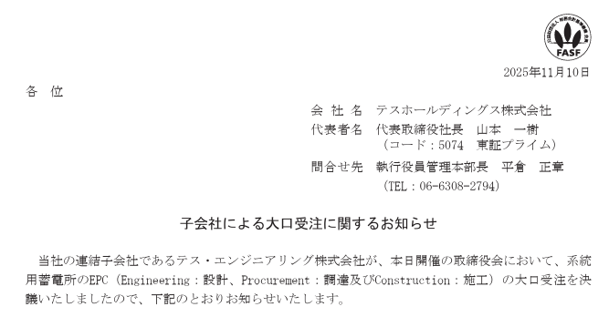 【蓄電関連】テスHD:系統用蓄電所EPCを約90億円で受注、東京センチュリー連携案件