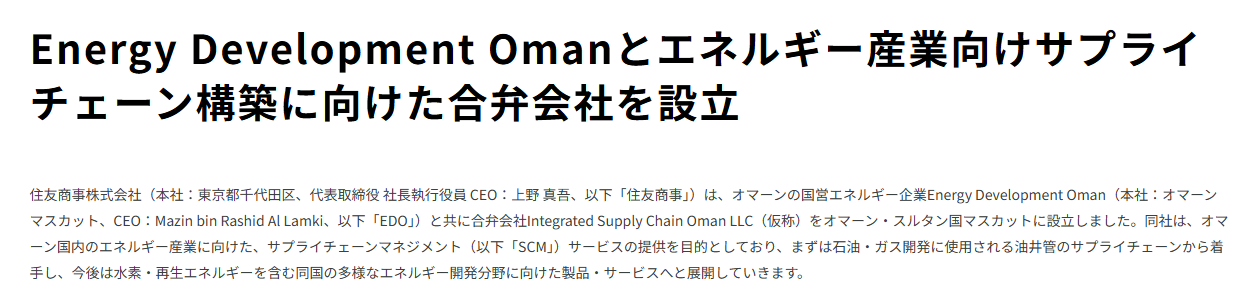 【提携・M&A・新会社】住友商事:オマーン国営EDOと合弁会社を設立、エネルギーSCM基盤を構築
