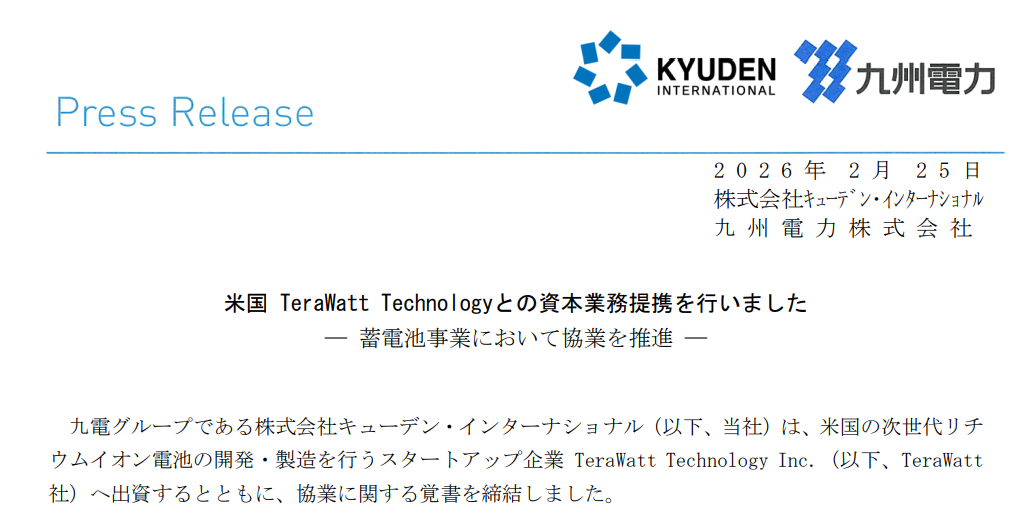 【蓄電関連】九州電力:米TeraWattへ出資、次世代電池で蓄電池事業を強化