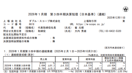 【決算】ダブル・スコープ:3Q累計売上91%減、持分法損失が重荷で最終赤字8604百万円