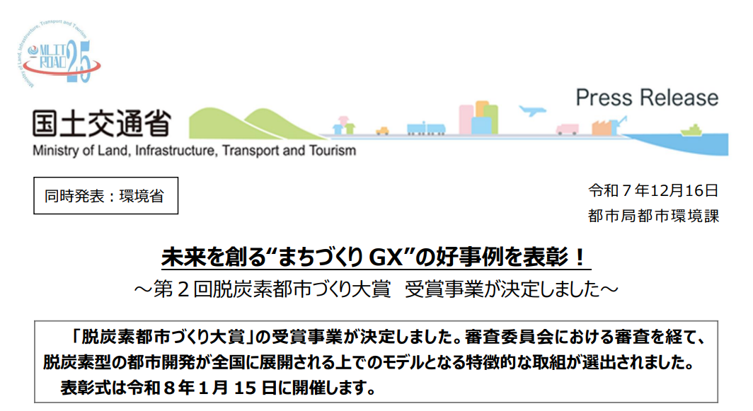 【表彰】国土交通省:第2回脱炭素都市づくり大賞決定、GX型都市開発を表彰
