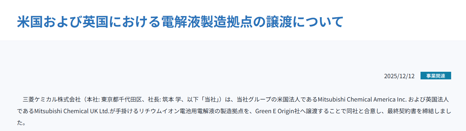 【海外】三菱ケミカル:米英の電解液拠点を譲渡、欧米で事業モデル転換