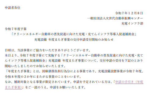 【補助金】次世代自動車振興センター:充電設備「年度またぎ事業」交付申請の受付開始