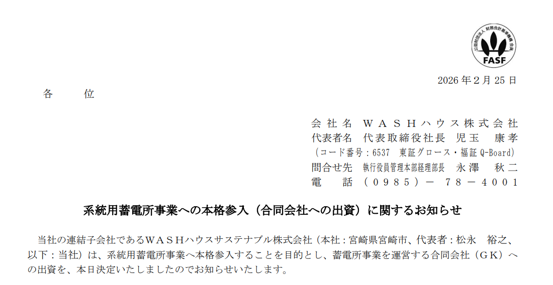 【蓄電関連】WASHハウス:系統用蓄電所へ本格参入、出資で第2の収益基盤構築へ